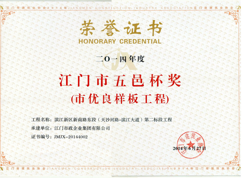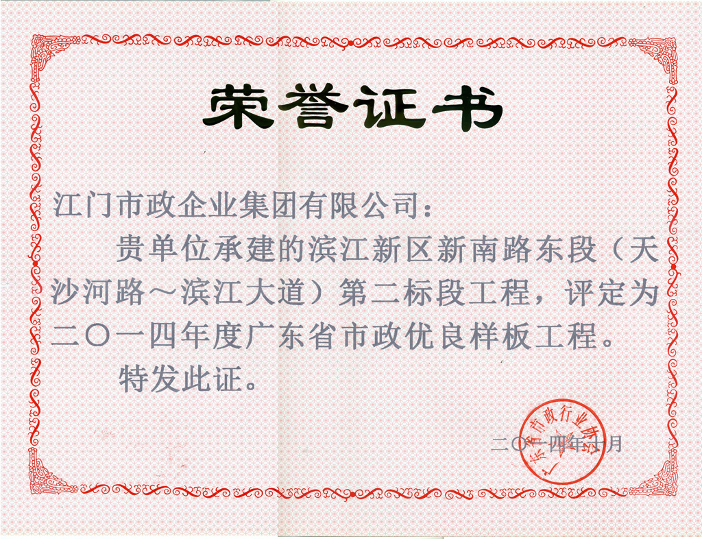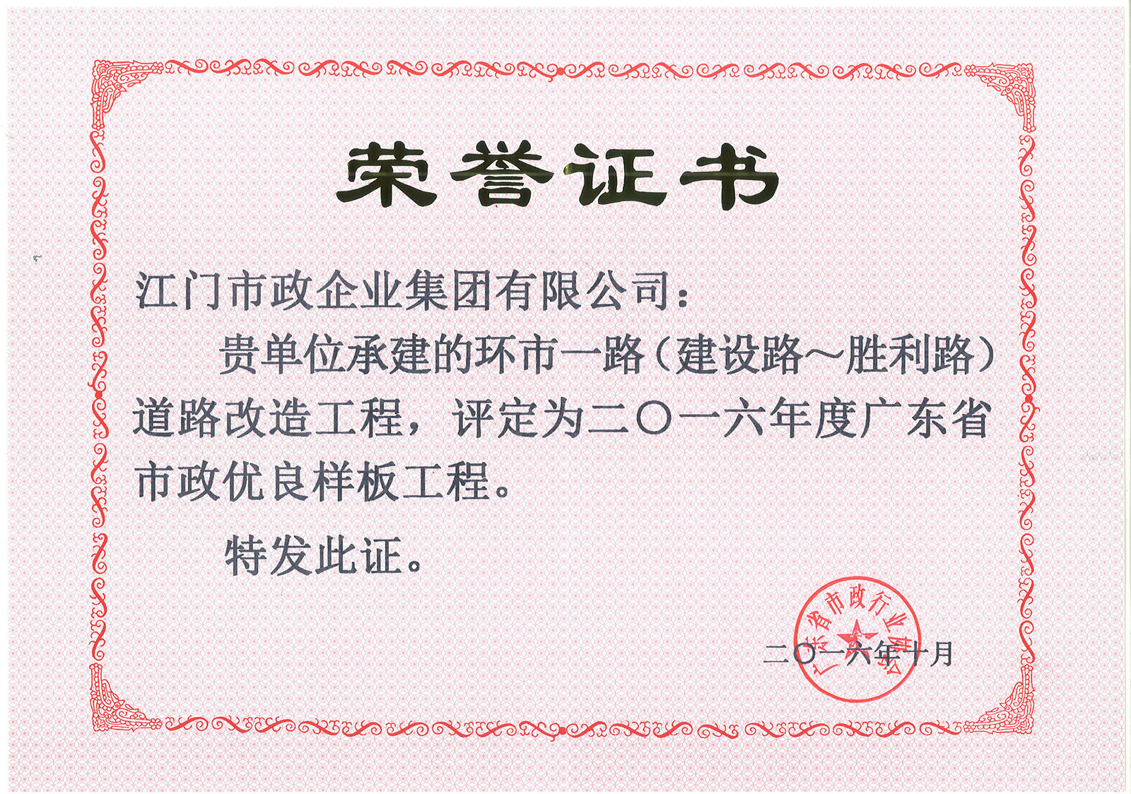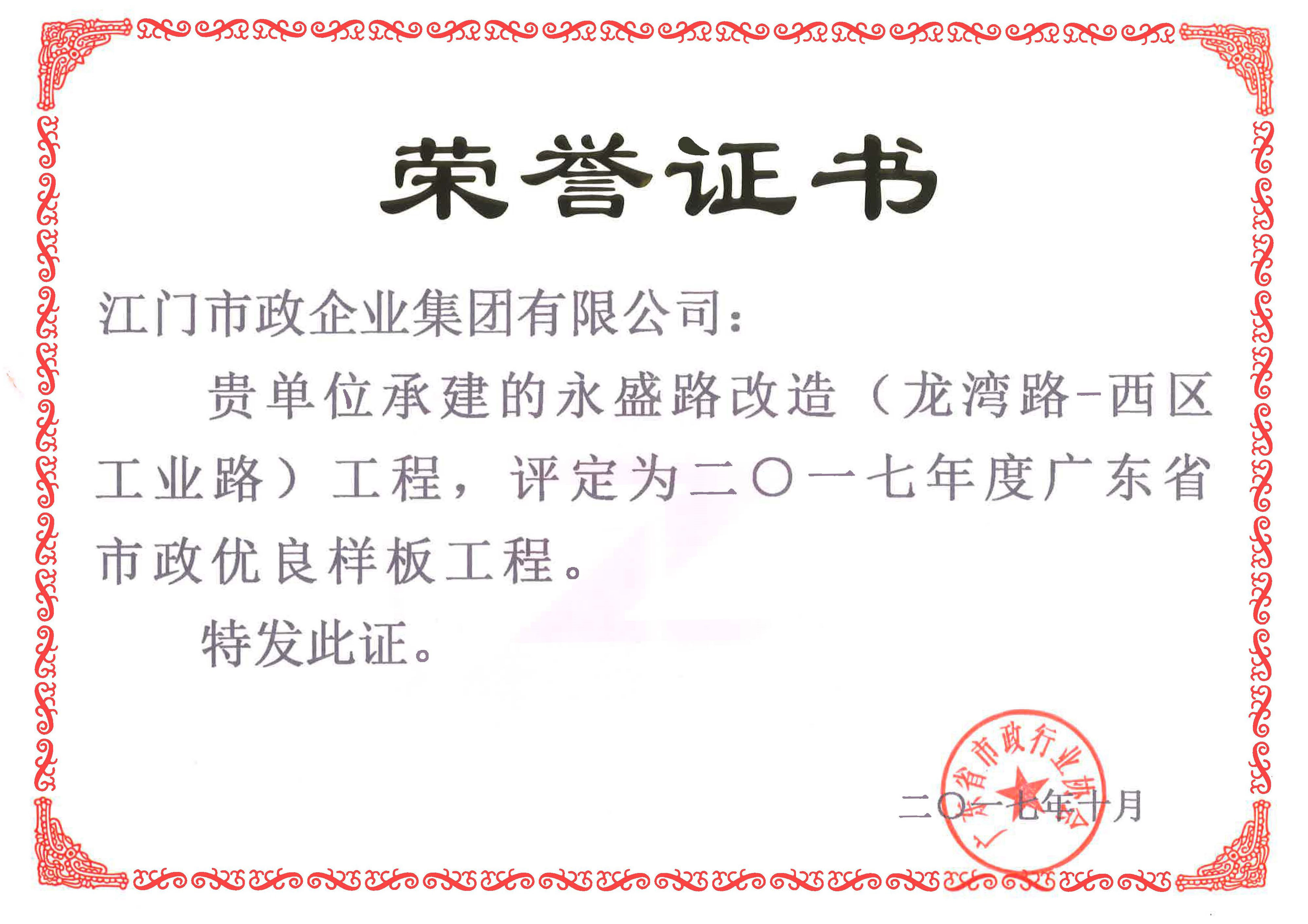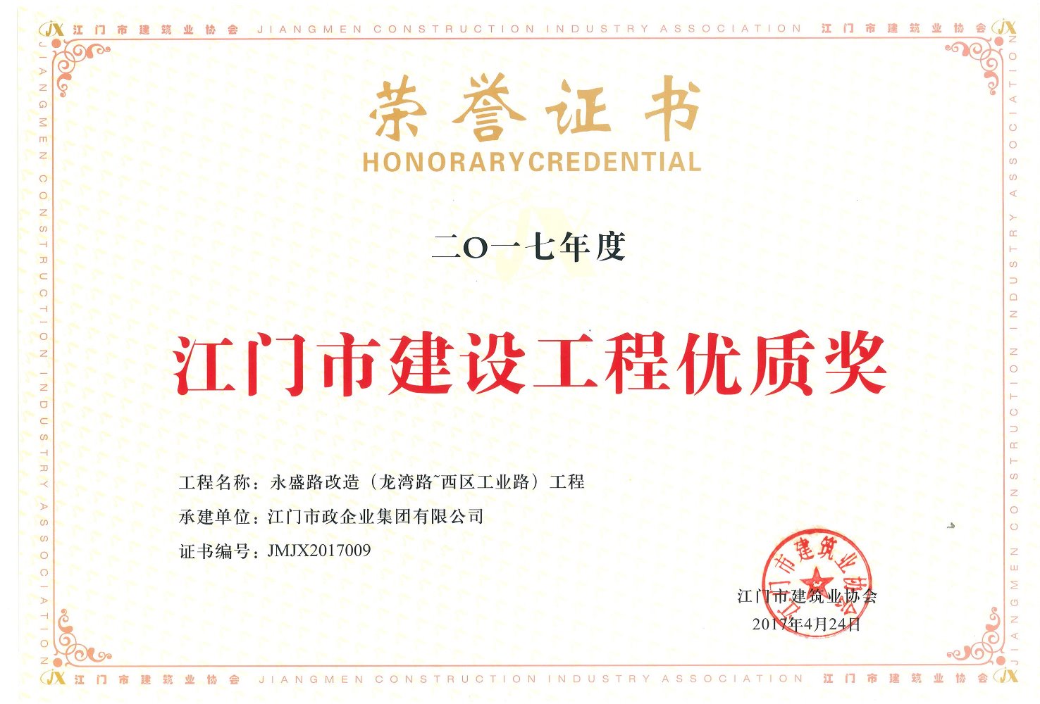2017年度江門(mén)市建設工程優(yōu)質(zhì)獎-永盛路改造(龍灣路~西區工業(yè)路)工程