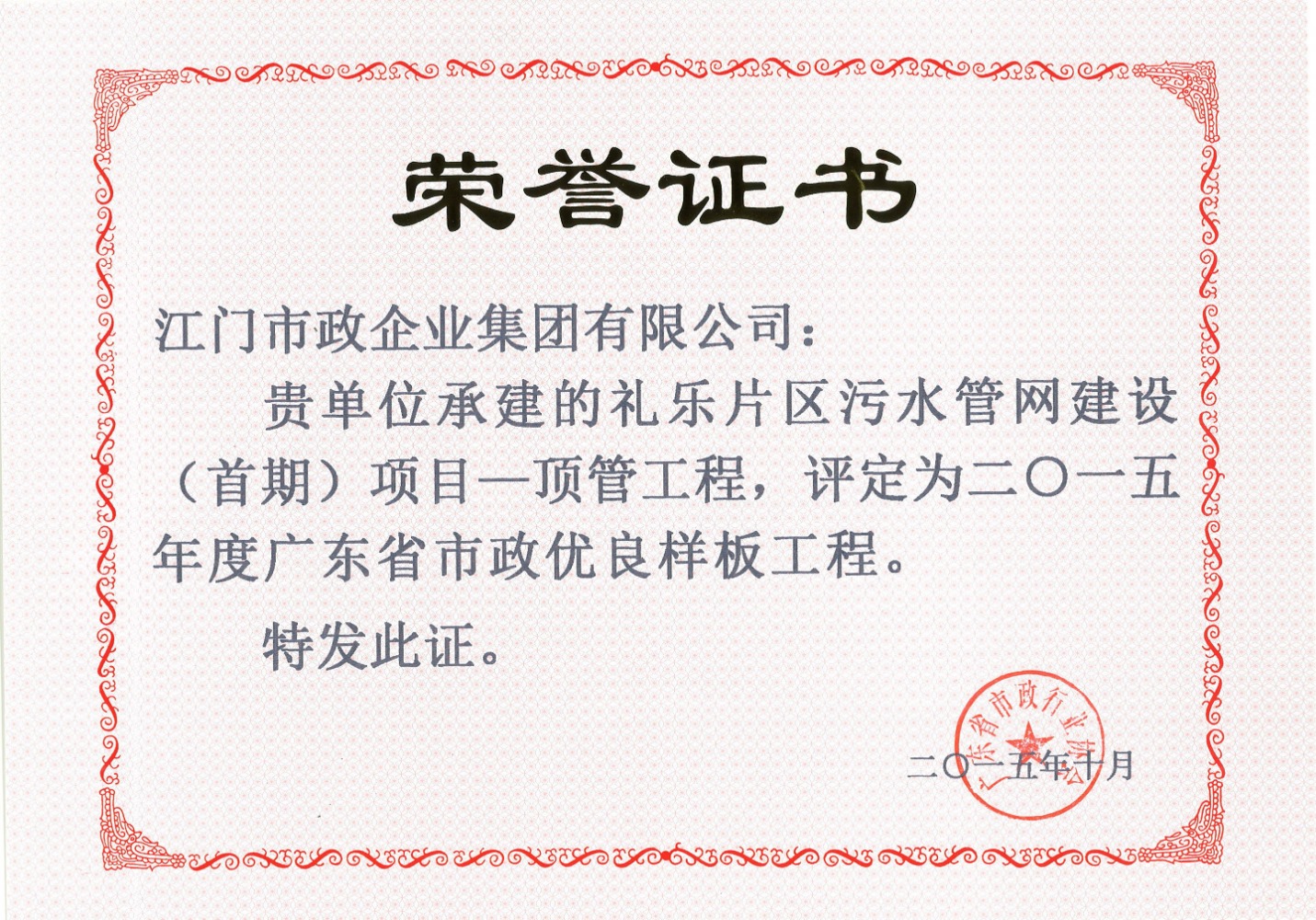 2015年省市政優(yōu)良樣板工程-禮樂(lè )片區污水管網(wǎng)建設(首期)項目-頂管工程(江門(mén)市