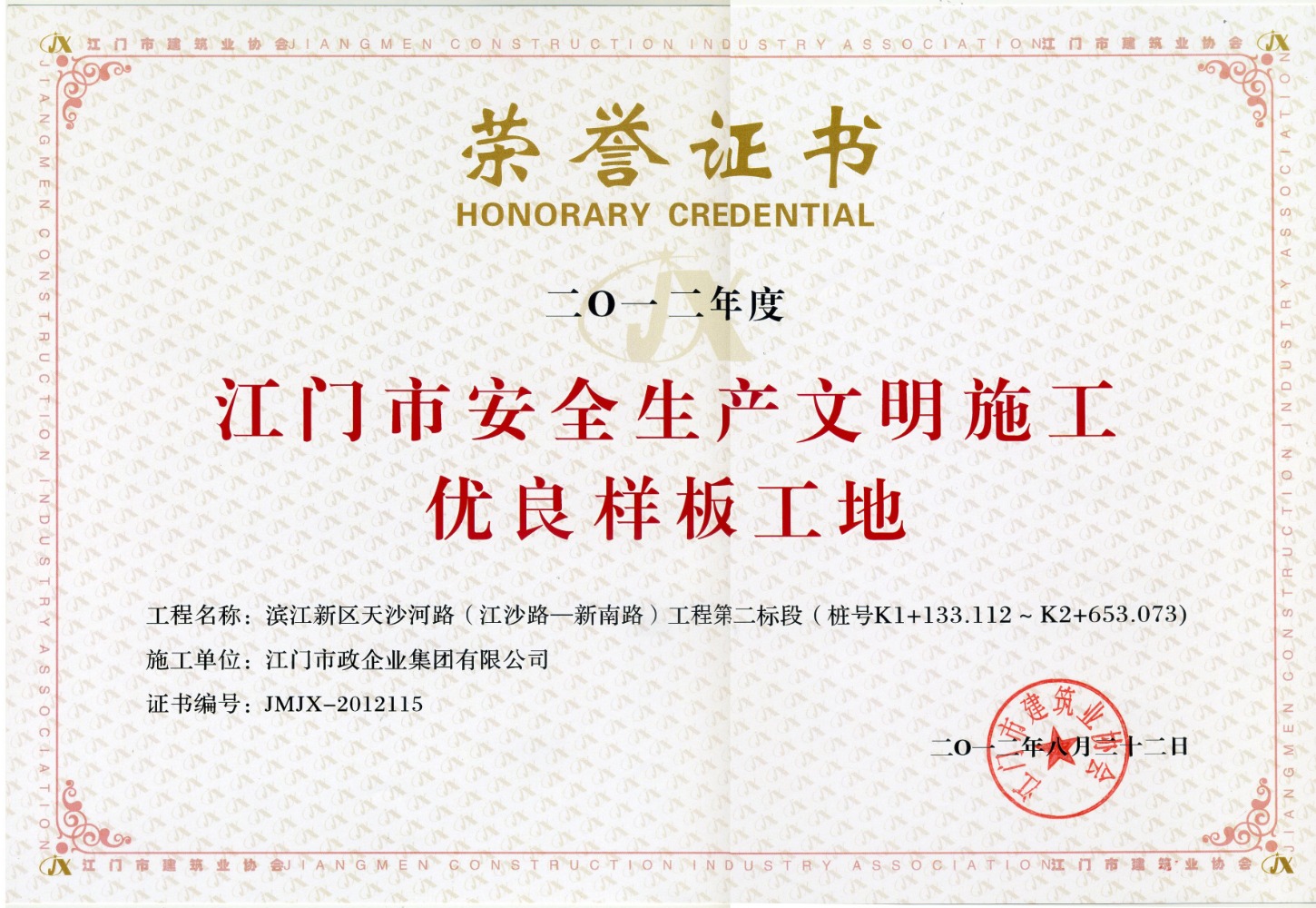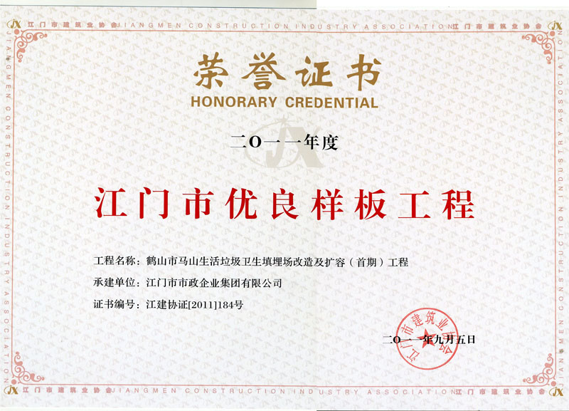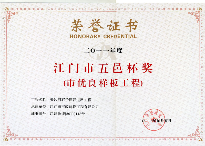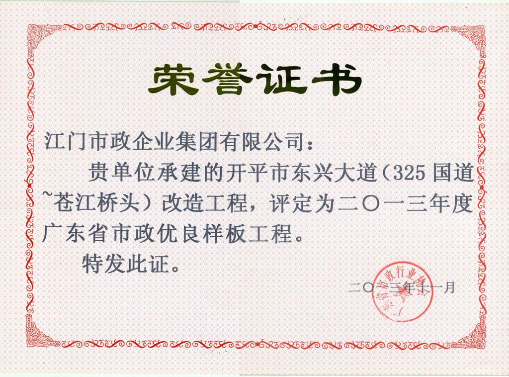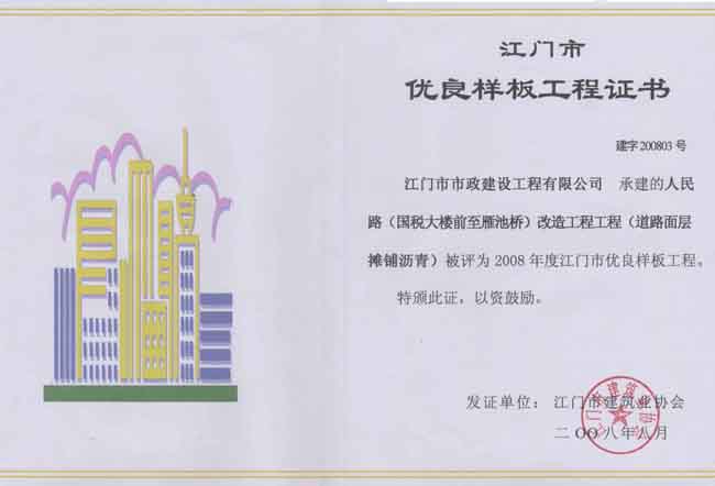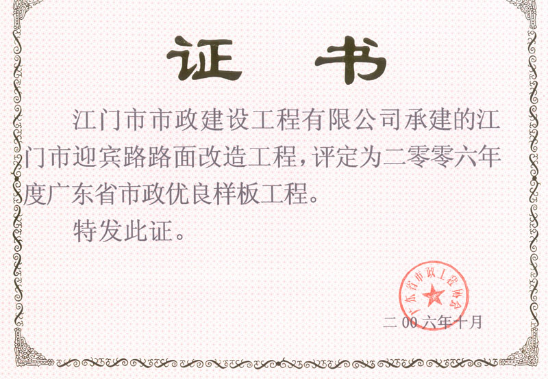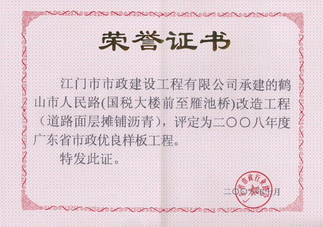 鶴山人民路優(yōu)良工程證書(shū)